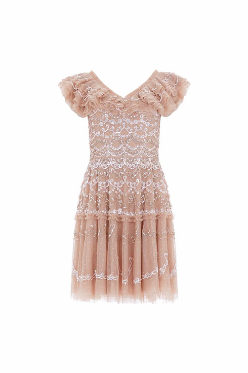The Everthine Micro Mini Dress in Sand. This dress is inspired by the hand-scripted love letters of Beethoven, featuring the words 'ever thine ever mine ever ours' on a delicate border. Beautifully designed with intricate sequin artwork developed from the smallest sequin to capture the exquisite detailing. Designed with a vintage, couture-style neckline and adorned with layers of soft tulle and net to create a voluminous, show-stopping skirt shape. This romantic dress will be a piece you'll forever treasure.