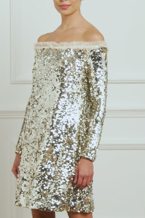 NEEDLE & THREAD EXCLUSIVE. The Evie Off-Shoulder Micro Mini Dress in Silver. This statement dress is decorated with sparkling sequins. Designed with an elegant off-shoulder design adorned with signature Needle & Thread tulle frills and slim long sleeves. Crafted with a flattering loose-fit A-line silhouette. Developed with an all-over sequin fabric featuring side-hole sequins that overlap to create a decadent, luxe, shimmering look with a stretch base for comfort and style. The dress also includes a mesh bralette for ultimate comfort and an easy fit. The perfect party dress you'll wear time and time again.
