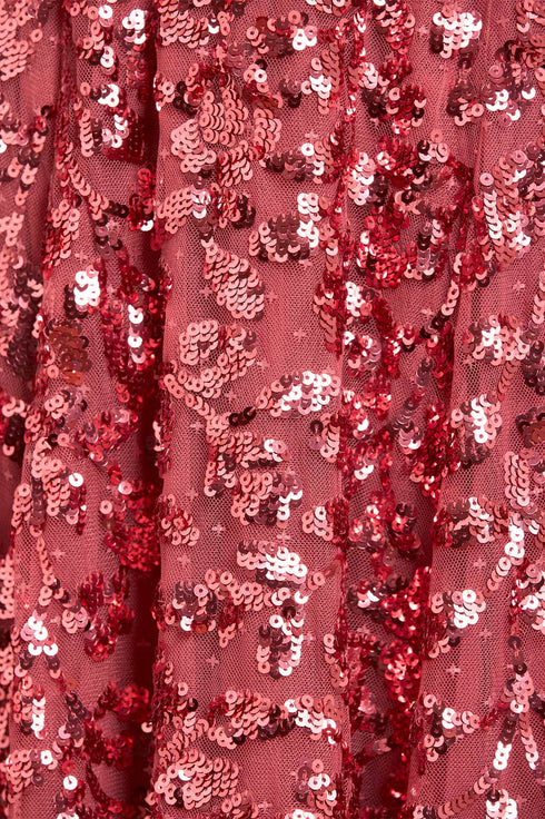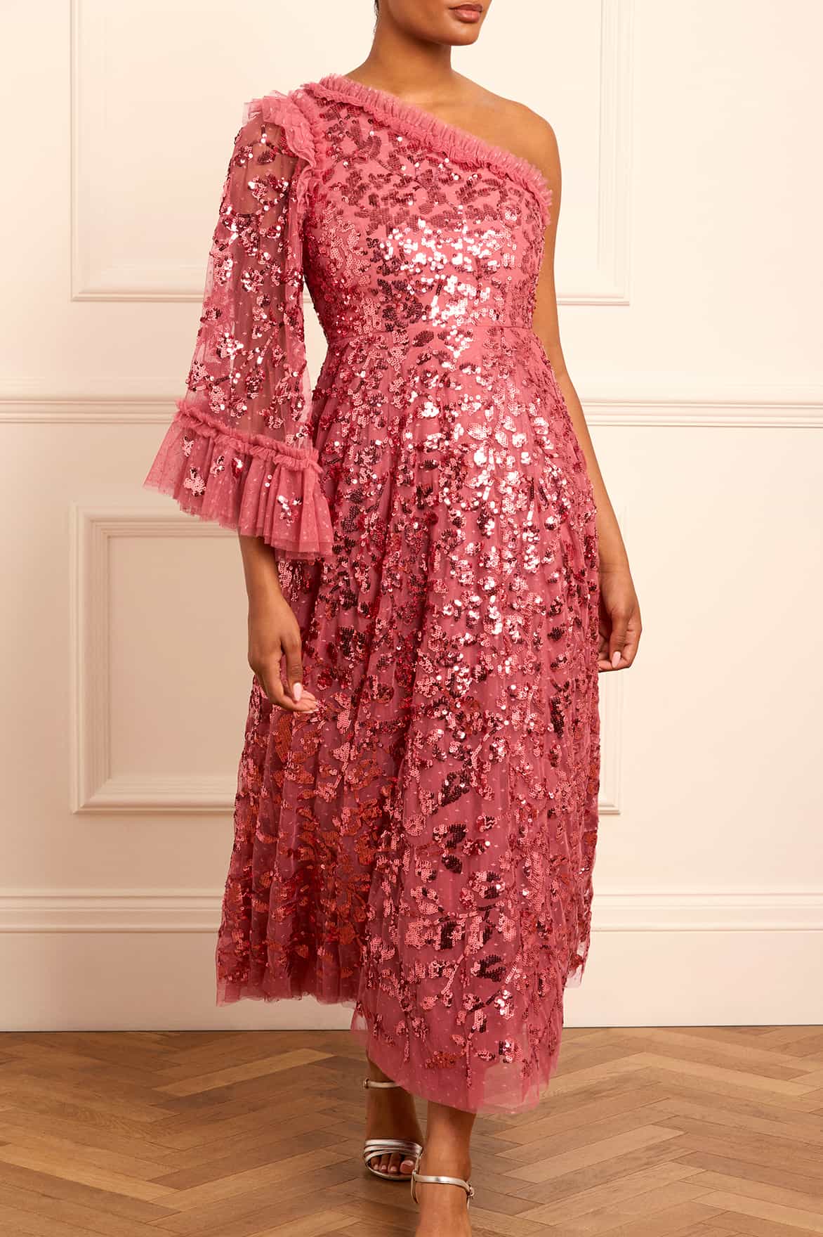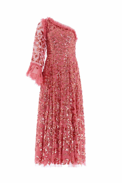 The Falling Leaves One-Shoulder Ankle Gown in Autumn Rose. Inspired by historical vintage couture, this romantic gown is designed with trailing sequin embellishment reminiscent of falling autumn leaves. This gown's one-shoulder design is highlighted by a voluminous sleeve that creates a statement silhouette, while soft tulle frills adorn the neckline, armhole, and cuff for signature Needle & Thread styling. The skirt, composed of generous layers of net and tulle, finishes with a sweeping hemline, perfect for making a graceful entrance on any special occasion.