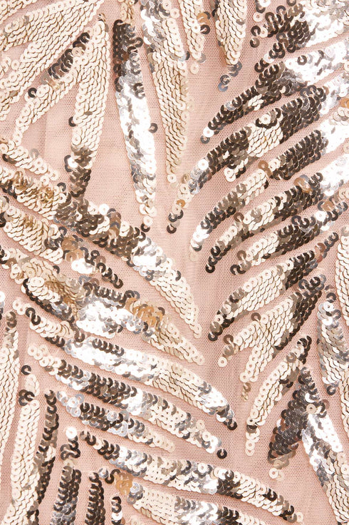 The Feather Sequin Short Open Cape in Dust Beige/Silver. This versatile cape is designed to pair with our Feather Sequin Strapless Ballerina Dress. This cape is decorated with statement feather sequin artwork inspired by costumes worn by the Follie’s dancers of the early 1900s. Adorned with signature Needle & Thread tulle frills and fastens at the neck with a hook and eye. A classic and contemporary style.
