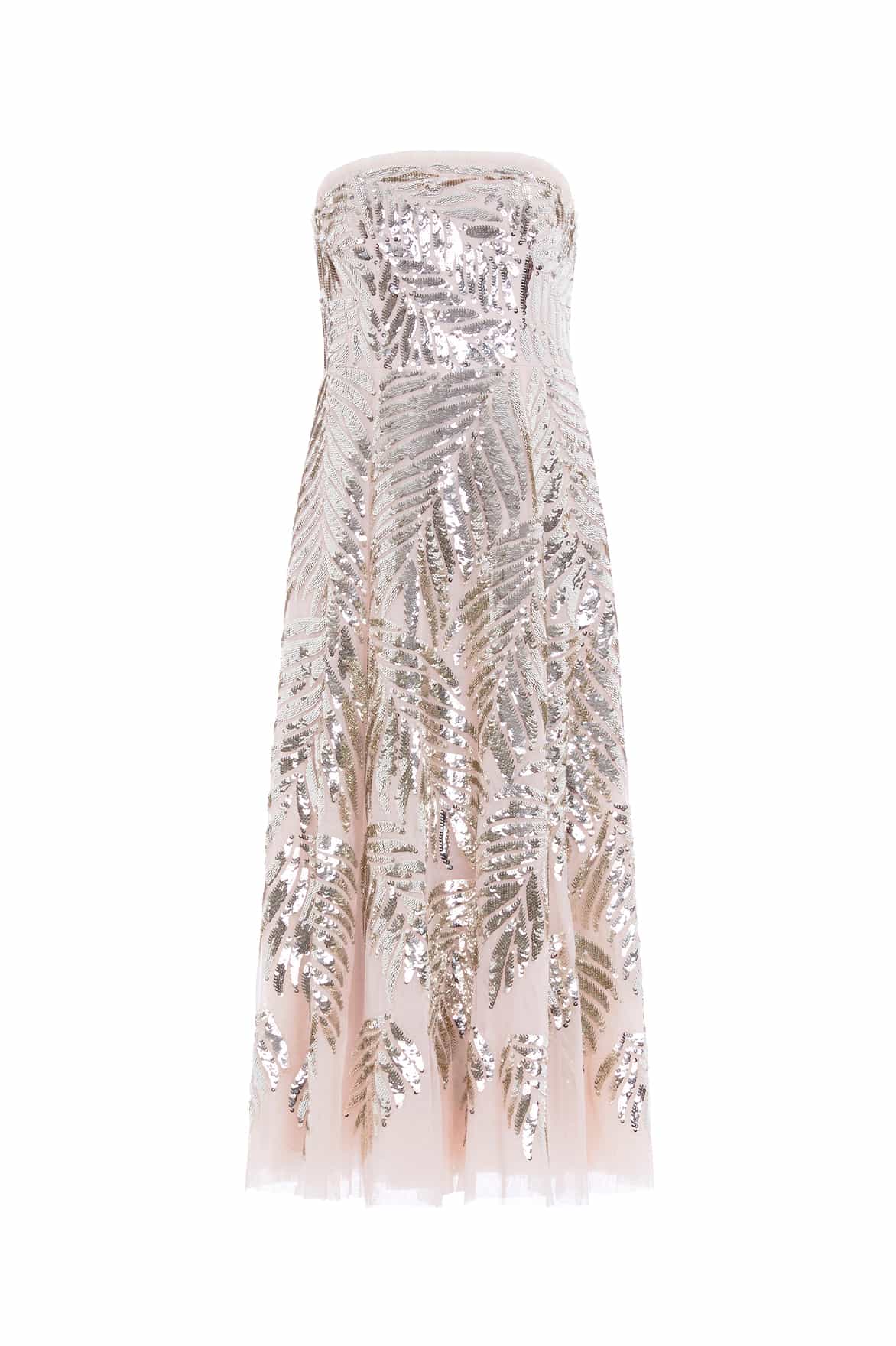 The Feather Sequin Strapless Ankle Gown in Beige/Silver. This show-stopping gown features statement feather sequin artwork inspired by costumes worn by the Follie’s dancers of the early 1900s. Beautifully designed with perfectly placed sequins gradually trailing towards the hem. Crafted with an elegant strapless design and signature Needle & Thread tulle frills at the neckline and shoulder. An internal corset construction in stretch power mesh ensures full comfort and fit while maintaining the garment’s shape. The skirt is developed with generous layers of net and tulle for a sweeping hemline. The perfect gown for an upcoming special occasion and beyond.