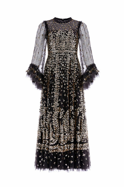 The Fern Ankle Gown in Graphite/Caramel. Inspired by a historical archive artwork, this gown features a shimmering statement sequin border on the skirt hem with a trailing glittering motif design that disperses towards the dress. Crafted in soft tulle with signature Needle & Thread frills, this luxurious style boasts voluminous sleeves with embellished motifs and romantic frills at the cuffs, adorned with glistening sequins. The sequins have a special high-shine gloss finish created by extra foil coating. The skirt is generously made up of layers of soft, delicate tulle and net. A classic and contemporary style.