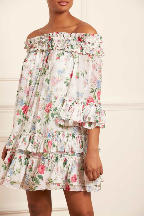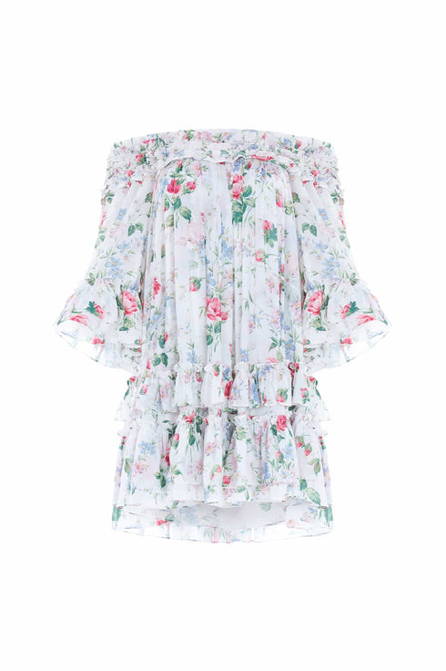 The Floral Fantasy Chiffon Off-Shoulder Micro Mini Dress in Moonshine. Designed with a beautiful floral print taken from an early 1900’s hand-painted wallpaper design. Decorated with romantic garden florals that create an all-over, organic layout in a whimsical flower artwork. This gown is developed from soft semi-sheer chiffon, creating an effortless, flowing style. Featuring an off-shoulder design and signature layered frills for a romantic edge. Designed with a generous voluminous sleeves to create a statement look. This style has a self-fabric belt for versatile styling.