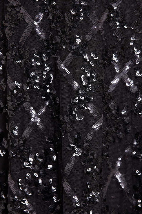 The Garden Lattice Ankle Gown in Graphite. This gown is designed with beautiful artwork incorporating delicate florals in a grid layout. Decorated with two sequin colours to highlight the definition of the design. Crafted with a V-shaped waist creating a flattering, easy-to-wear silhouette. Make a statement this season in the Garden Lattice.