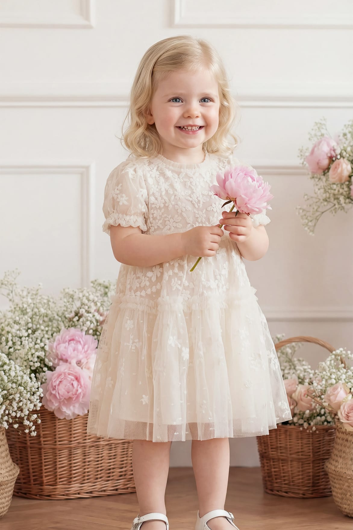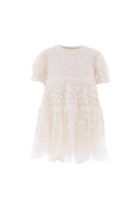 The Garland Ribbon Baby Dress in Cream. Features delicate floral embroidery and ribbon-inspired detailing for a soft, textural finish. Designed with lightweight layers for comfort, this piece offers a gentle, flowing silhouette.