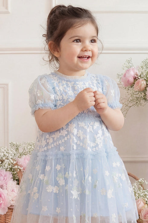 The Garland Ribbon Baby Dress in Dusk Blue/Cream. This charming dress features Victorian lace-inspired embroidery with pastel floral motifs. Delicate ruffled puff sleeves and frills at the neckline and shoulders add a sweet touch. The gathered skirt hem is finished with a playful frill for added volume. Lined in soft cotton voile for comfort, the set includes matching cotton dobby bloomers with frilled edges. The perfect dress for your little one’s upcoming special occasion.