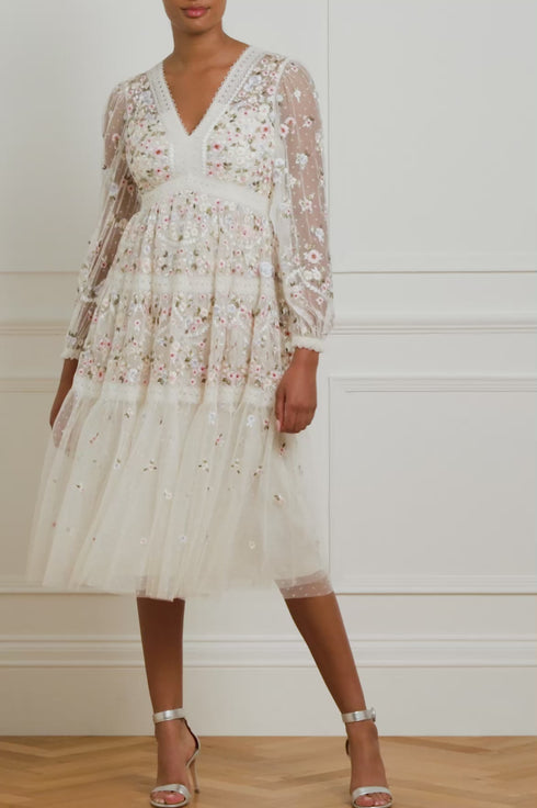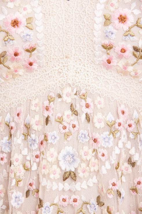 The Garland Ribbon Midaxi Dress in Cream. This embroidered dress is inspired by Victorian lace trims. Beautifully designed with floral embroideries in soft pastel tones. Developed with a V-shaped waist seam to create a flattering, effortless fit. This dress is adorned with intricate lace trims for signature Needle & Thread detailing. A pretty piece you'll forever treasure.