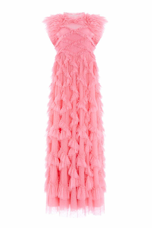 The Genevieve Rose Gown in Coral. Our bestselling gown in a new shade for the season ahead. This statement gown is inspired by 1930s Hollywood glamour. Beautifully designed with diamond tulle details and trims. Crafted with multiple layers of ruffled, frothy tulle sculpted for dramatic effect. Make the ultimate style statement this season.