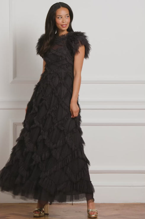 NEEDLE & THREAD EXCLUSIVE. The Genevieve Rose Gown in Graphite. This statement gown is inspired by 1930s Hollywood glamour. Beautifully designed with diamond tulle details and trims. Crafted with multiple layers of ruffled, frothy tulle sculpted for dramatic effect. Make the ultimate style statement this season.
