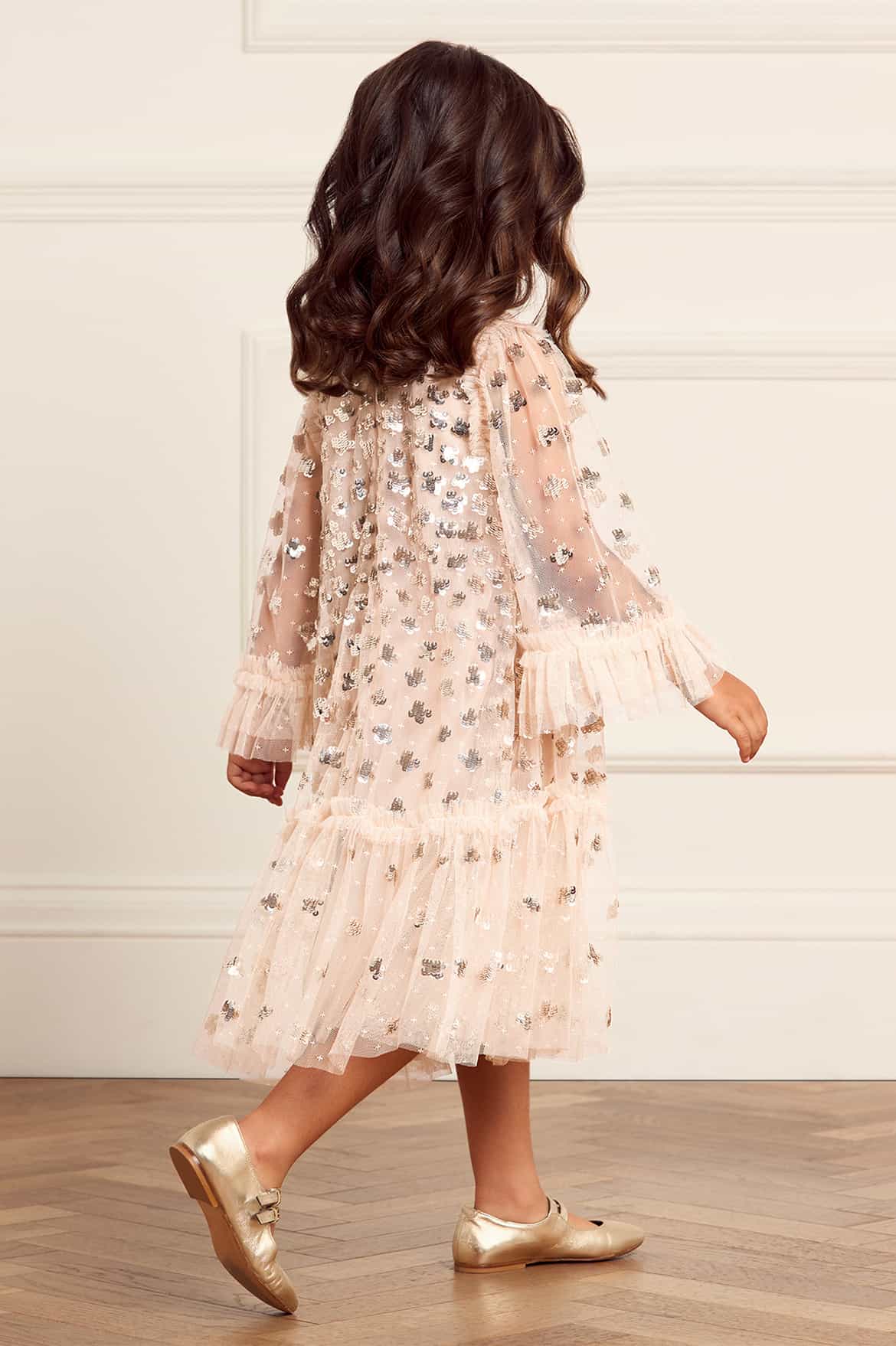 The Glisten KIDS Dress in Dust Beige/Silver. This dress is beautifully adorned with shimmering sequin motifs. Designed with loose-fit, fluted sleeves, and frill cuffs decorated with scattered sequins. Developed with signature Needle & Thread soft tulle ruffles at the neckline and shoulders add a fun, frothy texture. The skirt features generous layers of net and tulle with a sweeping hemline, perfect for twirling. The perfect dress for your little one's upcoming occasions.