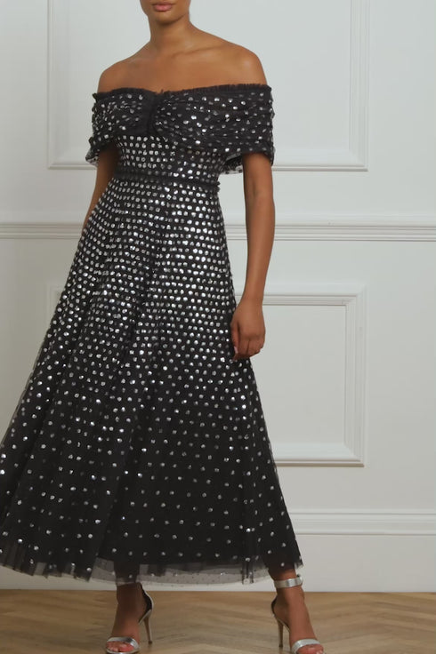 The Grace Gloss Off-Shoulder Ankle Gown in Graphite / Silver. This gown is beautifully decorated with high-shine sequins in dot motifs creating an enchanting, shimmery effect. Crafted with an off-the-shoulder design inspired by iconic Grace Kelly, capturing the elegance of her look perfectly. Designed with an integrated corset for the perfect shape and structure. You'll forever treasure the Grace Gloss.