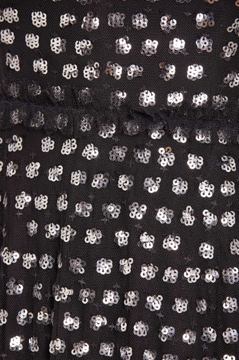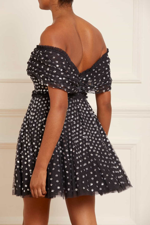 The Grace Gloss Off-Shoulder Micro Mini Dress in Graphite / Silver. This dress is beautifully decorated with high-shine sequins in dot motifs creating an enchanting, shimmery effect. Crafted with an off-the-shoulder design inspired by iconic Grace Kelly, capturing the elegance of her look perfectly. Designed with an integrated corset for the perfect shape and structure. You'll forever treasure the Grace Gloss.