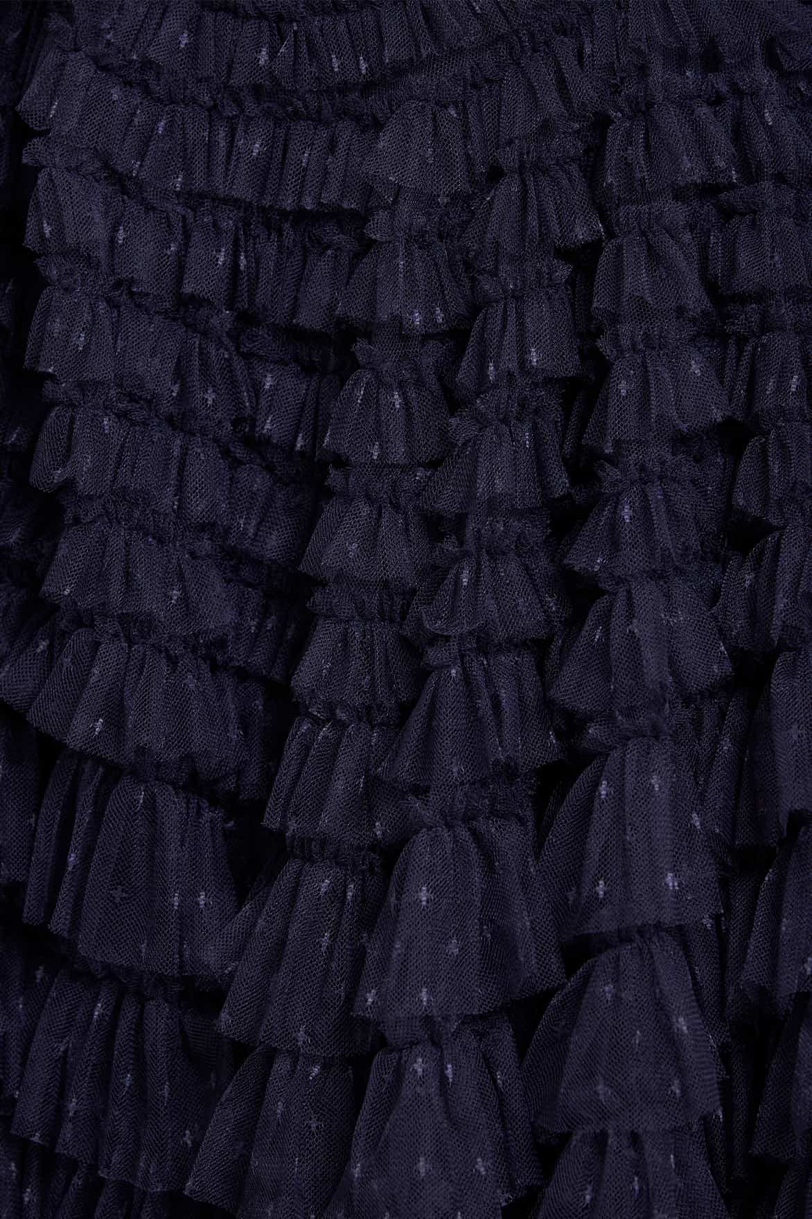 NEEDLE & THREAD EXCLUSIVE. The Hattie Ruffle Skirt in Navy. This textile skirt is engineered with layers of soft tulle and net to create a signature Needle & Thread style. Crafted with individual ruffles to create a beautiful, frilly texture. Designed with a sweeping hemline and finished at the waist with a satin ribbon for extra detail. We recommend pairing this skirt with our knitwear for a romantic Needle & Thread look.