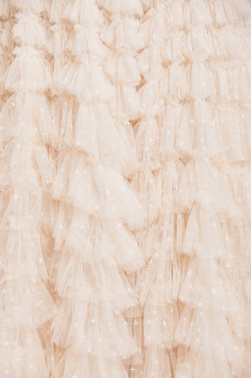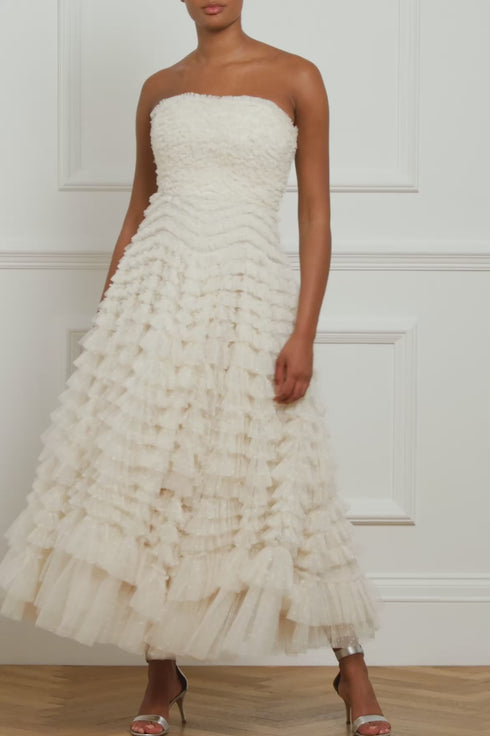 The Hattie Ruffle Strapless Ankle Gown in Cream. This gown is elegantly developed with layers of frothy tulle creating a soft, wavy textile. This strapless gown features signature Needle & Thread ruffles and frills for intricate, romantic detailing. Make the ultimate statement in the Hattie at your next event.