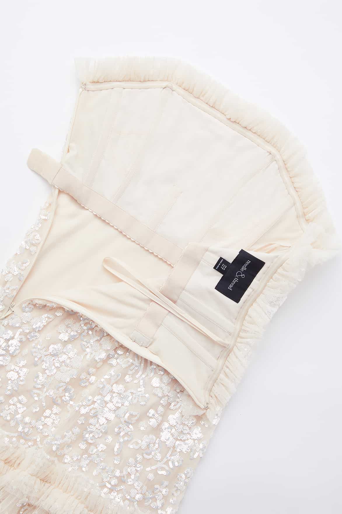 The Hattie Ruffle Strapless Ankle Gown in Cream. This gown is elegantly developed with layers of frothy tulle creating a soft, wavy textile. This strapless gown features signature Needle & Thread ruffles and frills for intricate, romantic detailing. Make the ultimate statement in the Hattie at your next event.