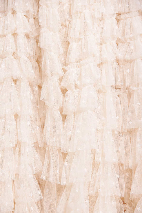 The Hattie Scoop Neck Ankle Gown in Cream. This enchanting gown showcases Needle & Thread’s signature tulle frills, artfully placed in wavy, graduated layers that cascade towards a sweeping hemline. A frill-trimmed scoop neckline adds delicate charm, while the voluminous skirt, crafted from layers of net and tulle, moves with ethereal grace. A timeless piece for the most special occasions.