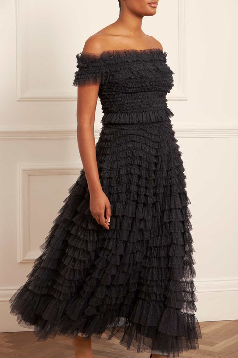 The Hattie Smock Off-Shoulder Top in Graphite. This top is beautifully developed in our soft, signature tulle and fully stretch fabric featuring an elasticated smocking that creates comfort and style. The smocking detail is beautifully decorated with vintage-inspired embroidery adding a romantic look. We recommend styling it with our Hattie Ruffle Skirt for an elevated, elegant look.