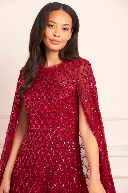 NEW SEASON. The Heart Lattice Ankle Gown in Red. Inspired by the eternal romance of the Bright Star collection, this gown is adorned with embroidered heart motifs entwined within a lattice of sequins, reminiscent of Victorian artwork. Crafted in layers of airy tulle, the fitted bodice and softly flared skirt echo the rhythm of poetry, while the bold red palette amplifies its passion. A gown designed for moments that feel as timeless as the stars.