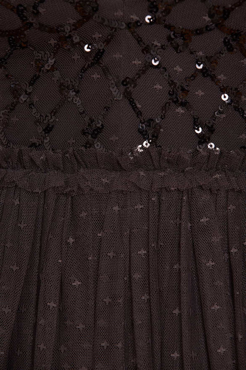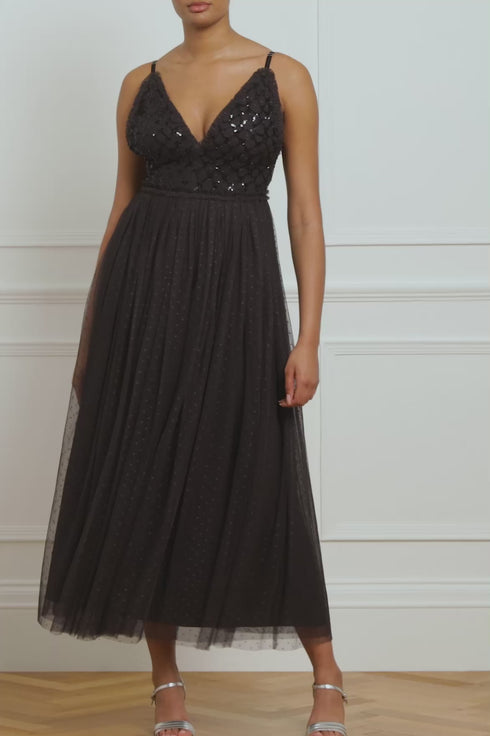 The Heart Lattice Bodice Cami Ankle Gown in Graphite. The bodice of this gown is decorated with intricate embellishment made using smallest sequins for exquisite detailing. Beautifully designed with heart-shaped motifs in a lattice layout. The skirt is developed with layers of frothy tulle to create effortless styling. The perfect style for an upcoming special occasion.