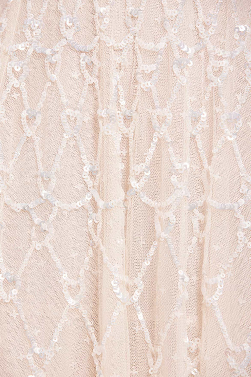 The Heart Lattice Micro Mini Dress in Cream. This dress is decorated with intricate embellishment made using the smallest sequins for exquisite detailing. Beautifully designed with heart-shaped motifs in a lattice layout. This dress features a cape for romantic detailing and a statement look. Make an entrance at your next event.