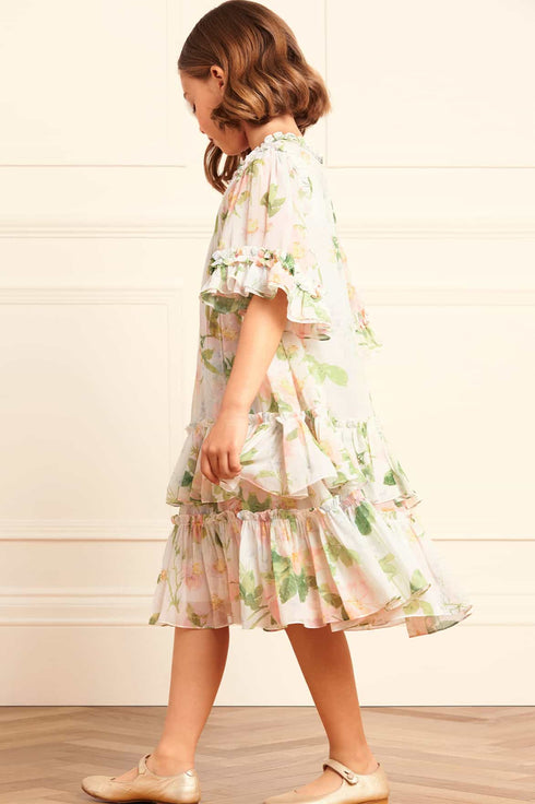 NEW SEASON. The Immortal Rose Sunny Chiffon KIDS Dress in Moonshine. This dress is designed with a beautiful print, inspired from an antique early 1900's hand-painted artwork. Designed with the prettiest wild rose motifs in soft pastel pink, intertwined with vibrant green foliage. Developed with a playful trapeze silhouette, featuring voluminous sleeves and softly gathered frill tiers. Created in our soft chiffon fabric for a floaty, fluid shape. The perfect everyday piece for your little one.