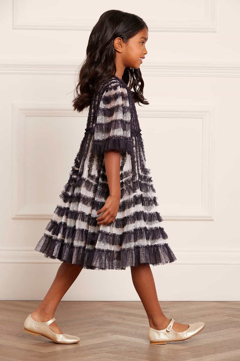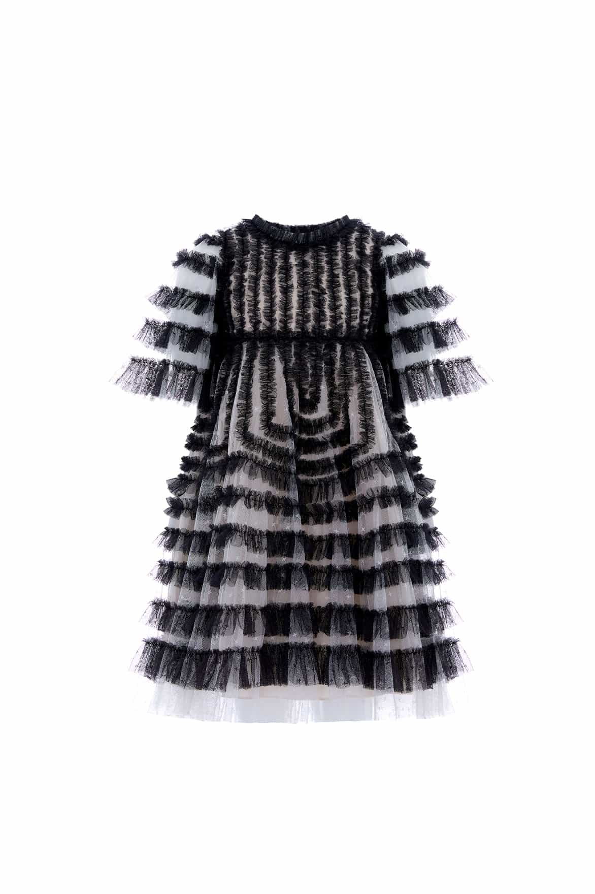 NEW SEASON. The La Vie En Rose Kids Dress in Cream / Graphite. This beautiful dress is adorned with delicate tulle ruffles, engineered throughout the panels to enhance the silhouette. Crafted with gathered tulle in a contrast colour to the base fabric creates a soft, gentle effect. The perfect dress for all their upcoming special events.