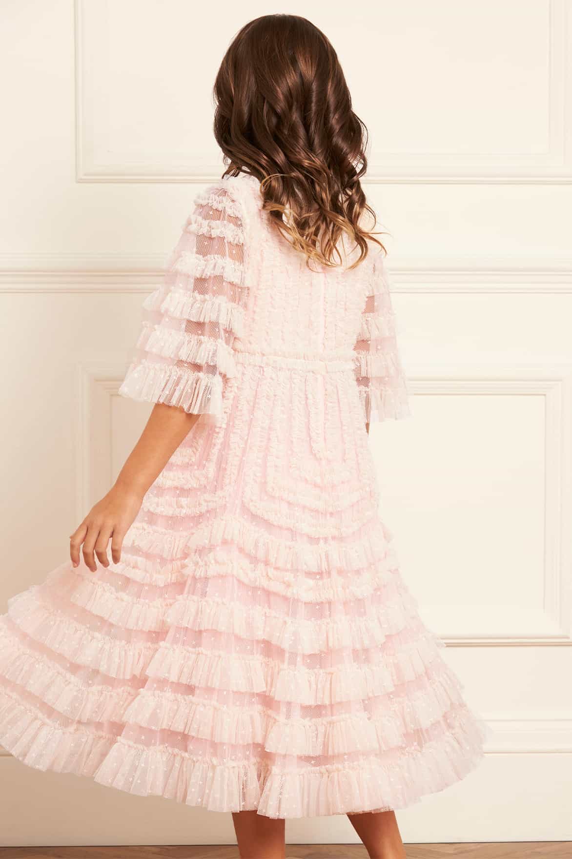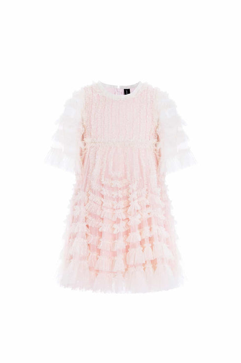 The La Vie En Rose Kids Dress in Dusk Pink/Cream. This pretty dress features delicate tulle ruffles, artfully arranged to enhance the silhouette. Contrast-coloured gathered tulle adds a soft, ethereal touch to the design. A timeless, graceful piece, perfect for all your little one's upcoming special events.