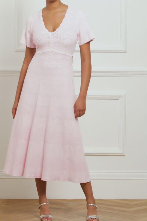 NEW SEASON. The Lace Knit Gown in Peony Pink. This knitted gown is developed from recycled viscose blend, with stretch yarn for a beautiful, flattering texture. Decorated with stitch pointelle details inspired by vintage woven lace ribbons. Crafted with a fitted stretch bodice, a feminine V-neckline and scalloped trim details for a romantic look.