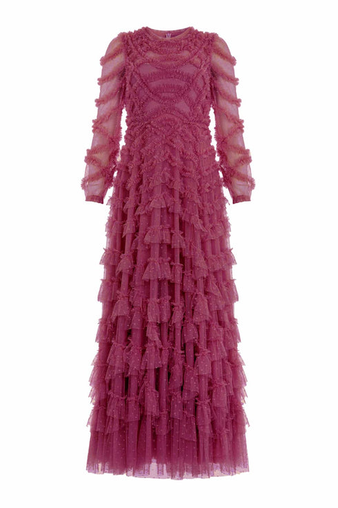 The Lana Round Neck Gown in Pink Topaz. This beautiful gown is adorned with engineered tulle frills to create a romantic textile. Developed with a round neckline and long sleeves for an elegant look. Beautifully crafted with layers of soft tulle for a whimsical, statement texture. Expect all eyes on you in this magical Needle & Thread piece.