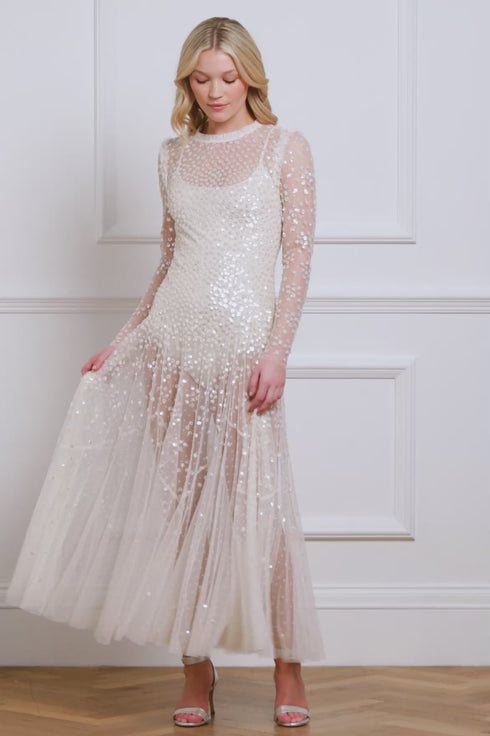 The Leila Dot Sheer Ankle Gown in Cream. This gown features shimmering dot motifs that create a glittering effect, with sequins coated for a lustrous, high-shine finish. Designed as a sheer statement dress, it includes an integrated stretch bodysuit for comfort. Crafted with slim sleeves and a round neckline, adorned with signature Needle & Thread tulle frills, complete the look. The ultimate piece for an upcoming special occasion.