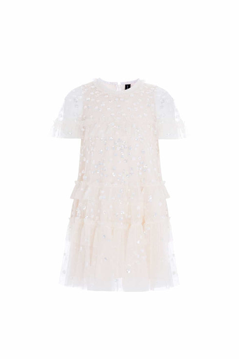 The Leila Dot Tiered Cape Kids Dress in Cream. This dress features shimmering dot motifs and foil-coated sequins for a lustrous, glittering effect. A playful cape with frills and signature Needle & Thread tulle frills at the neckline add charm, while the loose-fit silhouette ensures comfort. The frothy, tiered tulle skirt creates volume for perfect twirls. A magical, timeless piece for your little one’s wardrobe.