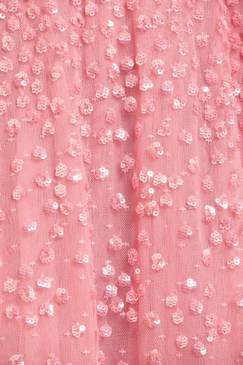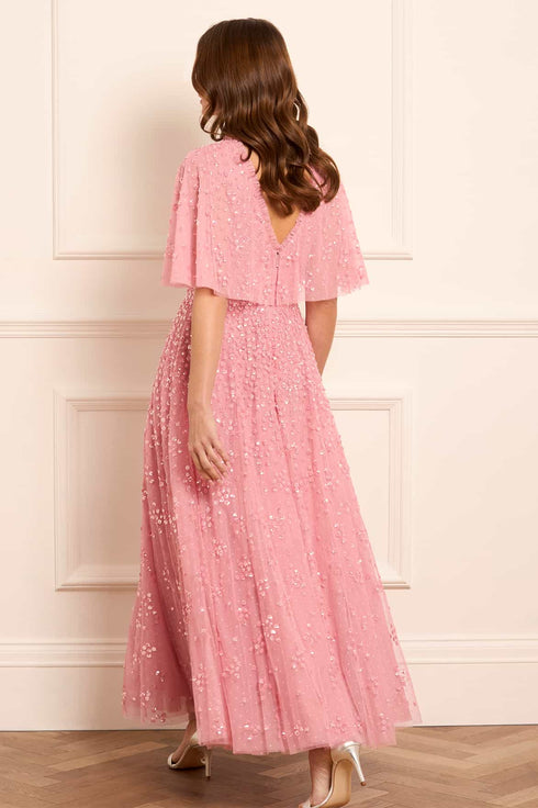 The Leila Dot V-Neck Cape Ankle Gown in Primrose is embellished with shimmering clustered dot motifs for a sparkling effect. This elegant V-neck gown features slim sleeves and signature Needle & Thread tulle frills at the neckline and armholes. The skirt, crafted from layers of net and tulle, finishes with a sweeping hemline. A captivating design.
