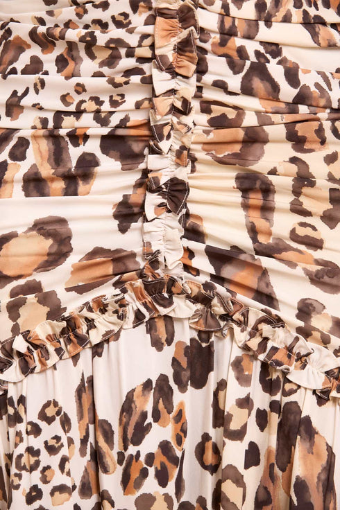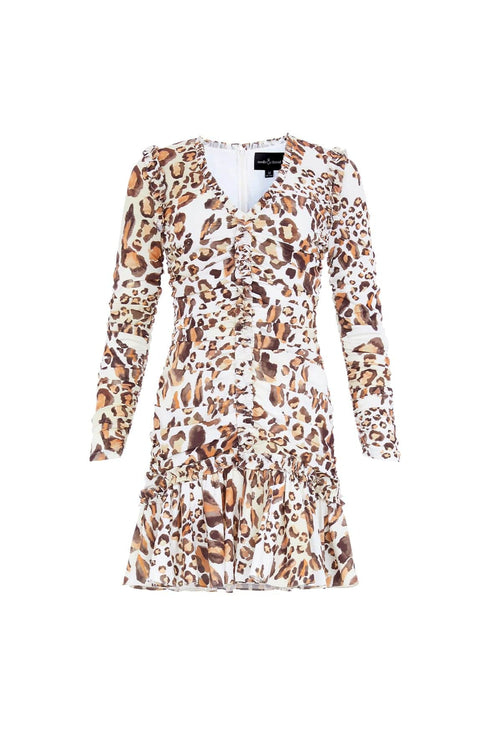 The Leopard Ellen Crepe Micro Mini Dress in Moonshine. This mini dress features a statement print that was hand-painted in-house using watercolour, with soft leopard motifs varying in scale and showcasing watery definition. Crafted from crepe fabric with stretch, it offers a flattering fit across the body. The softly gathered bodice and slim sleeves, with a gathered hem tier, provide playful styling. The V neckline is adorned with delicate Needle & Thread signature frills, adding an elegant touch. A stylish piece you'll forever treasure.