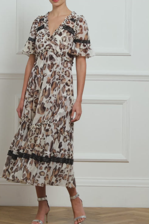 The Leopard Sonata Georgette Ballerina Dress in Moonshine. This statement print was hand-painted in-house using watercolour, with soft leopard motifs varying in scale and showcasing watery definition. Created in soft georgette fabric, it creates a flowing silhouette. The semi-sheer nature of the fabric allows the layered printed lining to show through, adding extra dimension to this beautiful print artwork. Inspired by vintage Victorian garments, it features lace insert detailing in perfectly engineered panelling. The perfect dress to take you from day to night.