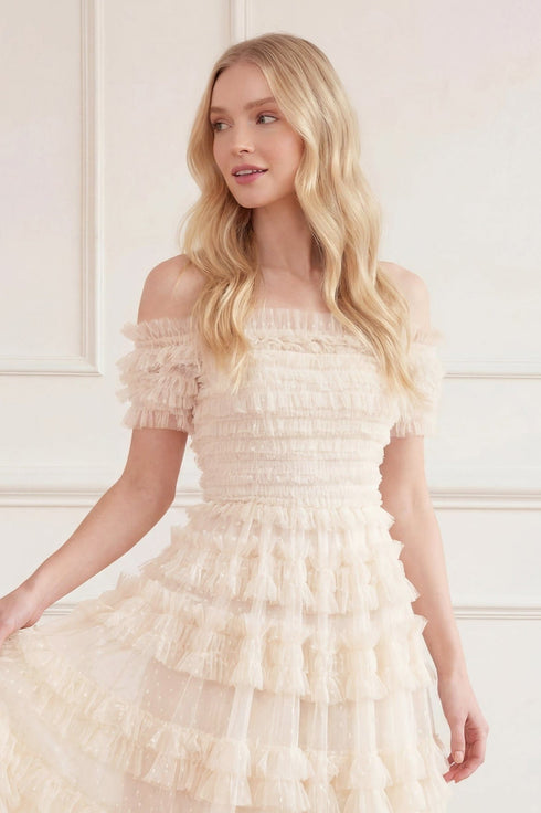 The Lisette Ruffle Off Shoulder Gown in Champagne. This statement gown has an elegant off-the-shoulder design inspired by Hollywood styling. Crafted with textile tulle and double-stitched frills for a dramatic, romantic effect. Features an integrated corset for a perfect fit and to hold the silhouette. Expect all eyes on you in this romantic gown.