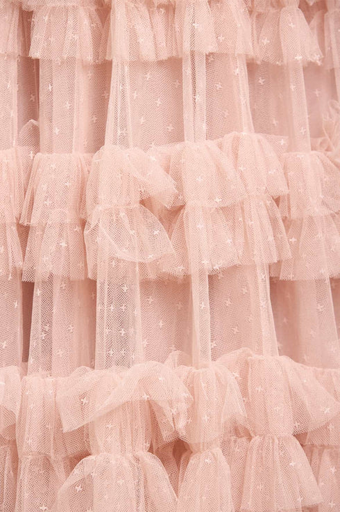 The Lisette Ruffle One-Shoulder Gown in Pearl Pink combines elegance and romance. Featuring a one-shoulder silhouette and soft tulle ruffles, it showcases Needle & Thread’s signature style with frills that graduate in size towards the hem. The skirt, crafted from layers of net and tulle, flows into a sweeping hemline, ensuring all eyes are on you.