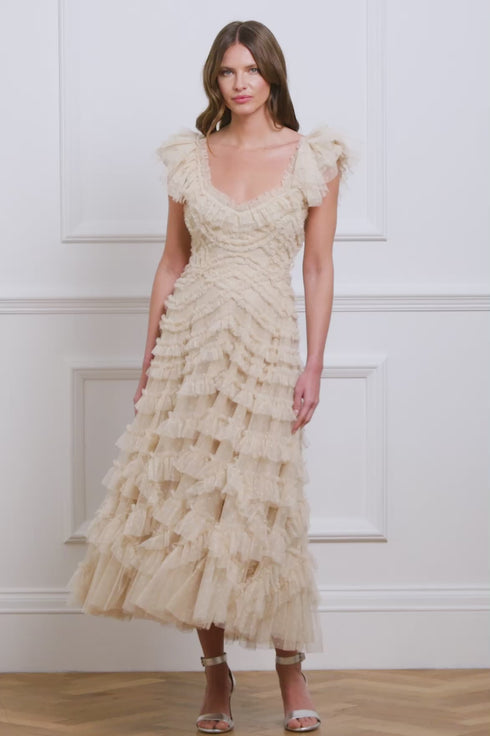 The Lola Backless Ballerina Dress in Parchment, a beautiful new addition for the season. Adorned with signature Needle & Thread elements, this dress features soft tulle and delicately gathered frills, creating a frothy, engineered texture. The backless design adds a romantic, playful touch, while the ballerina-length skirt enhances its graceful silhouette. Perfect for weddings, birthdays, or any special occasion, this dress promises to be a showstopper.