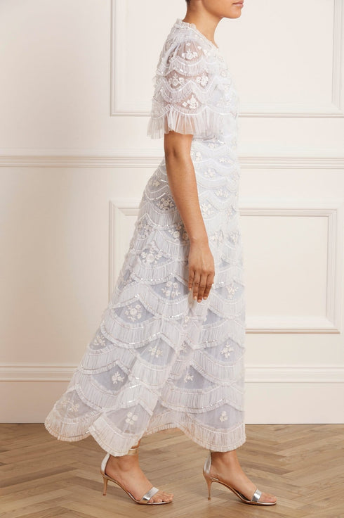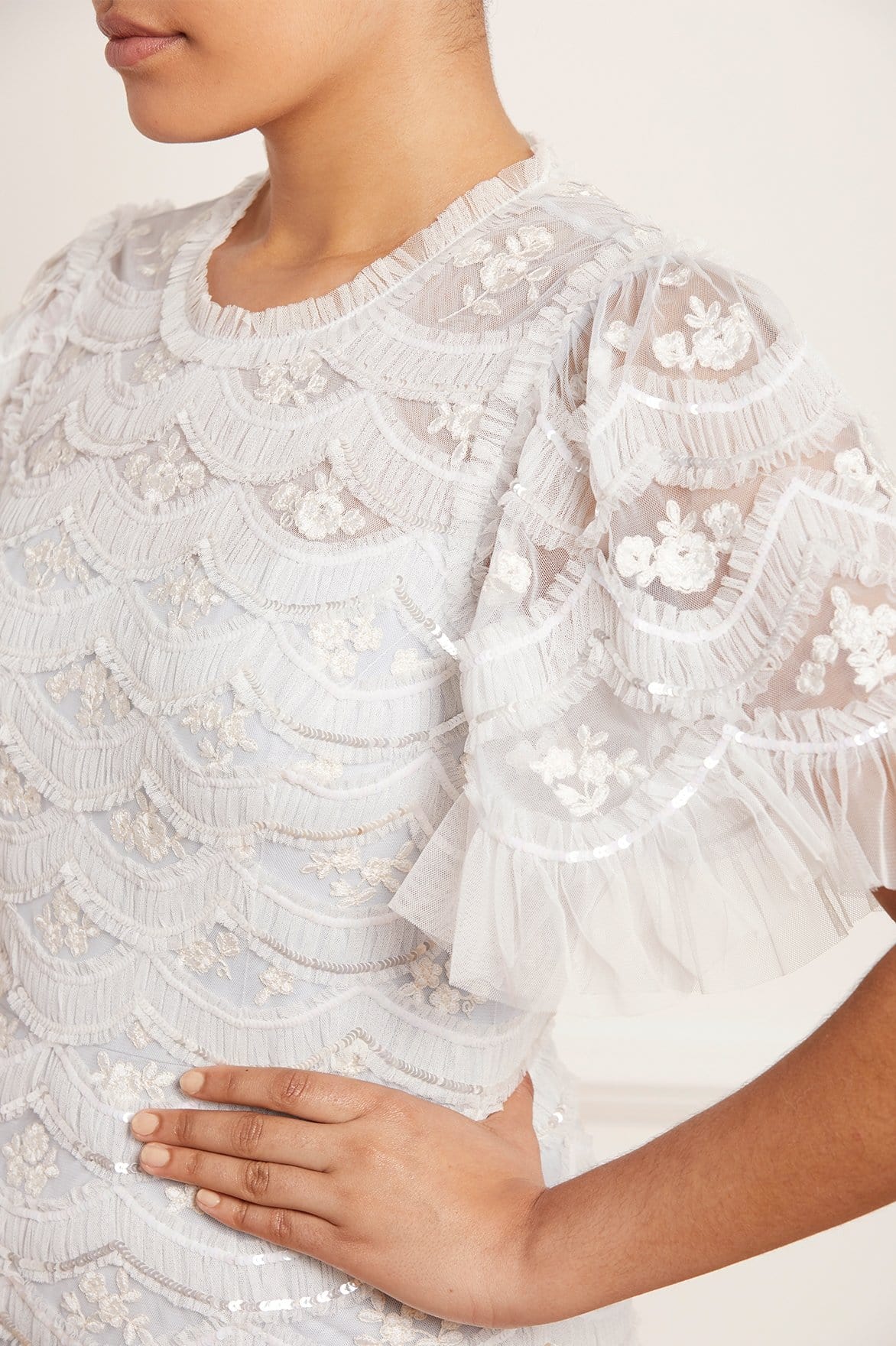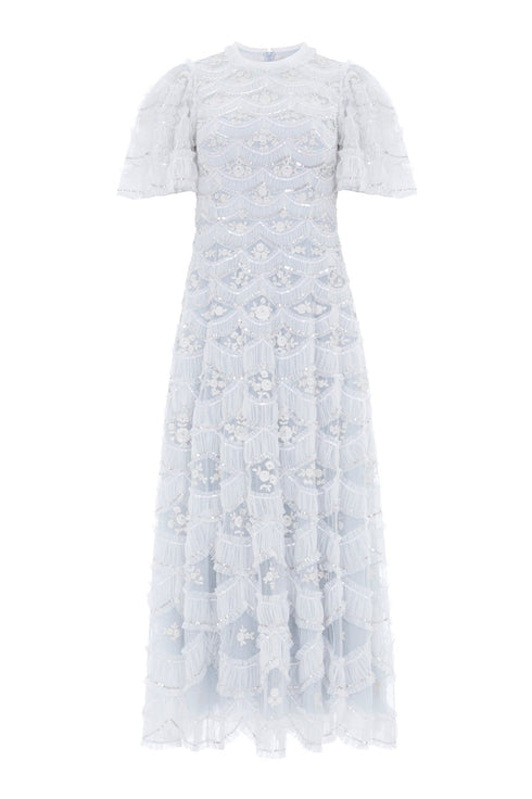 The Lunette Blossom Ankle Gown in Blue Mist This gorgeous gown is inspired by traditional Wedgwood ceramics, and is beautifully adorned with floral embroidery motifs, shimmering sequins and delicately gathered tulle scallop borders with contrasting ivory detail. Designed with pretty fluted sleeves, a flattering silhouette and a romantic aesthetic throughout. The perfect gown to take you from day to night.