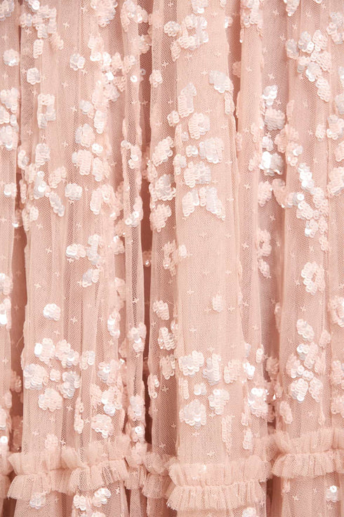 NEEDLE & THREAD EXCLUSIVE. The Maeva Ankle Gown in Pearl Pink is an exclusive Needle & Thread style, featuring floral sequin motifs on the bodice and sleeves, with trailing borders fading towards the hem. The high-shine sequins are enhanced with a foil coating, while tulle frills add signature detail. The voluminous skirt, made of layers of net and tulle, finishes with a sweeping hemline. A key piece in our collection.