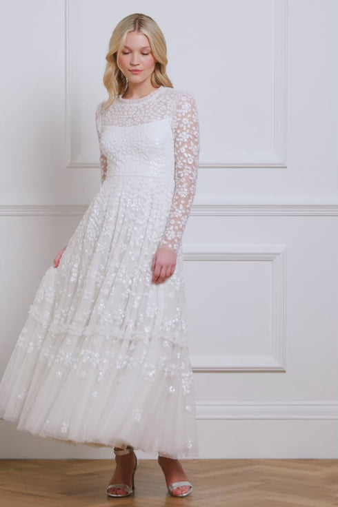 NEEDLE & THREAD EXCLUSIVE. The Maeva Ankle Gown in Swan White is an exclusive Needle & Thread style, featuring floral sequin motifs on the bodice and sleeves, with trailing borders fading towards the hem. The high-shine sequins are enhanced with a foil coating, while tulle frills add signature detail. The voluminous skirt, made of layers of net and tulle, finishes with a sweeping hemline. A key piece in our collection.