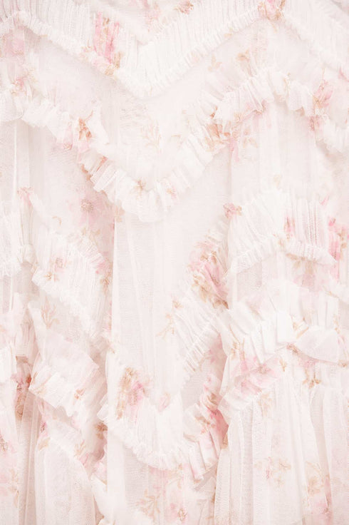 NEW SEASON. The Magnolia Ditsy Elia Halter-Neck Gown in Moonshine/Seashell. Adorned with whimsical floral motifs that scatter across soft tulle. Designed with a halter neckline and statement sash tie, this gown perfectly balances modern simplicity with romantic detail.