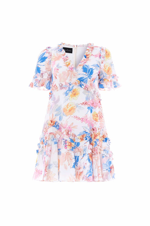 The Mariannes Floral Satin V-Neck Micro Mini Dress in Moonshine, inspired by Victorian botanical artist Marianne North. This mini dress features a vibrant floral print with bold brushstrokes. Crafted in luxurious satin, it boasts Needle & Thread frills at the neckline, shoulders, waist, and cuffs. Developed with fluted sleeves delicately frilled, and the skirt is enhanced with chevron-stitched satin frills. The flattering V waist seam and slim silhouette gently flare for a graceful, tea-dress-inspired fit, blending elegance with timeless charm.
