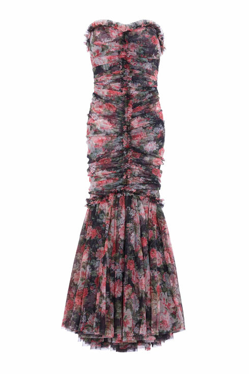 NEEDLE & THREAD EXCLUSIVE. The Midnight Dance Strapless Ankle Gown in Graphite. Beautifully printed with a floral design featuring luxurious blooms taken from archive, hand-painted artwork from the early 1900s. This gown features a slim silhouette with soft, flattering drapes across the body. The statement fishtail skirt is crafted from layers of signature Needle & Thread soft tulle and net for added drama. The elegant V-neckline is adorned with frothy tulle ruffles, featuring long slim sleeves. Crafted with signature Needle & Thread frills on the shoulder, skirt seam, and bodice for a touch of romantic styling. This gown creates the most stunning movement as you walk.