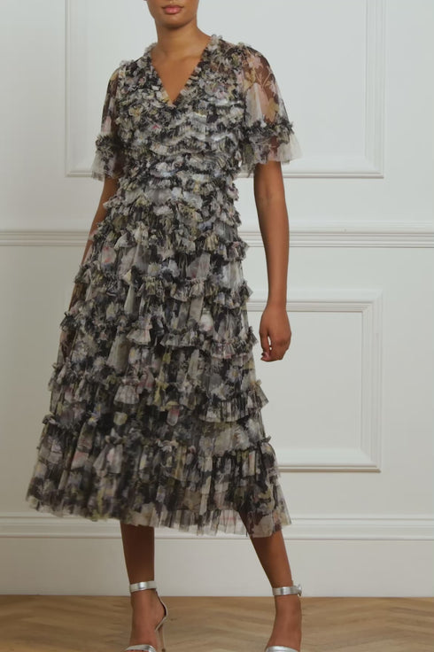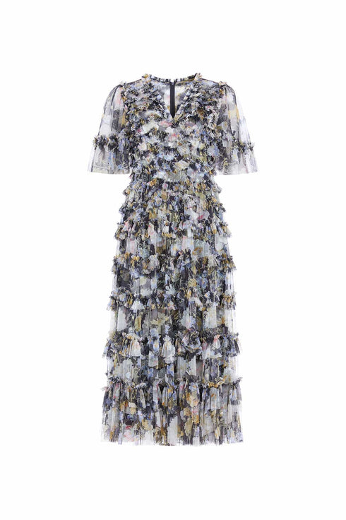 The Moonlight Petals V-Neck Ballerina Dress in Graphite. The print of this dress is taken from a 1900's hand-painted artwork. Beautifully printed with soft white peonies and silvery blue wildflowers creating an enchanting print. Crafted with signature Needle & Thread detailing featuring delicate tulle frills, scallop shape borders and frills creating romantic texture throughout. You can dress the Moonlight up or down depending on the occasion.