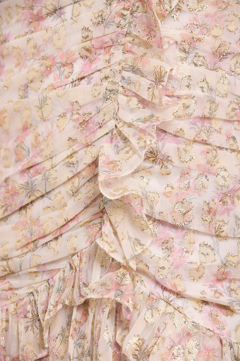 The Ophelia Ditsy Lurex One-Shoulder Ankle Gown in Moonshine/Pink. This romantic trailing print is taken from an archive, hand-painted artwork from the early 1900s, depicting soft, whimsical ditsy floating florals. This playful one-shoulder gown boasts a flattering gathered ruche detail engineered across the body and adorned with signature Needle & Thread frill detailing. Designed with a blouson sleeve featuring a ruffle cuff and romantic frills. The slim silhouette features a dropped waist seam with a flirty frill tier. The stretch lining fabric ensures fit and comfort. The perfect gown for an upcoming occasion.