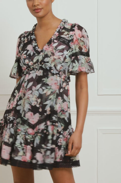 The Paradise Garden Sonata Georgette Micro Mini Dress in Graphite. The print of this dress is inspired by an enchanting paradise garden print, taken from an 1900s hand-painted artwork. This dress is designed with a luxe, twilight inspired colour palette in rich, lush floral motifs to create a truly alluring print. Developed in our soft georgette fabric creating a flowing silhouette. Designed with Victorian inspired garments featuring a lace insert detailing and panelling. A transitional day to night piece.