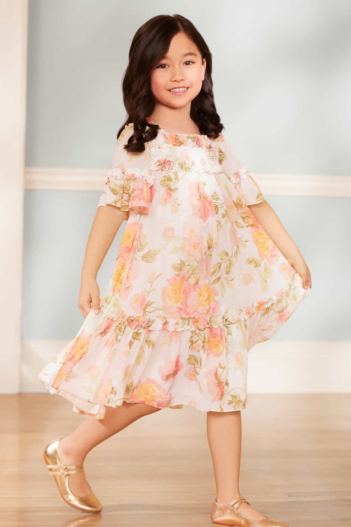 Peony Promise Chiffon Bella Kids Dress in Moonshine. This beautiful archive print features hand-painted sunset pink peonies in full bloom. Developed on a soft chiffon fabric featuring voluminous ruffles perfect for twirling. This dress is adorned with delicate frills for Needle & Thread signature styling. This pretty dress is perfect for picnic parties, birthdays and warmer weather getaways.