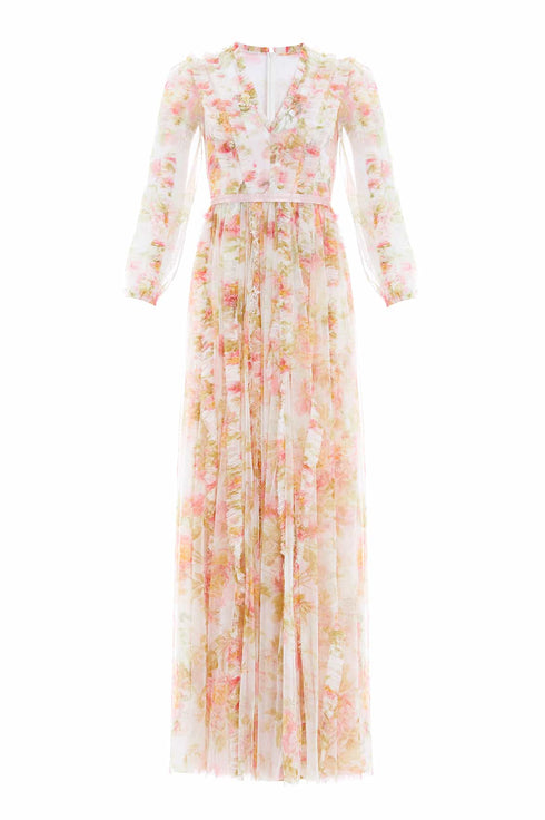 Peony. Promise V-Neck Gown in Moonshine. This gown is printed beautifully with hand-painted sunset pink peonies.. Beautifully created in our soft, delicate tulle fabric for a romantic look. Developed with gently gathered frills, stitched vertically throughout this style to create an ethereal texture to this signature Needle & Thread style. A style you'll wear time and time again.