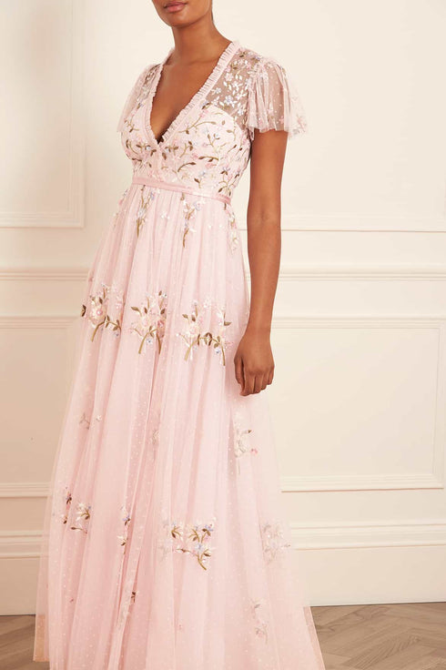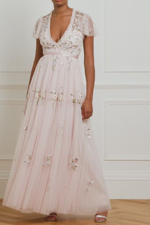 The Petunia Cap Sleeve Gown in Peony Pink. Inspired by Edwardian vintage artwork, this elegant gown is designed with rich embroidered bouquets of delicate florals in soft, pastel shades and subtle, vibrant green highlights. Shimmering iridescent sequins scattered throughout add a glistening effect to the piece. Intricately cut with fine, delicate tulle ruffles trimming the neckline and a voluminous skirt that features a net under layer to hold the shape and create a romantic silhouette. The ultimate fairytale style.