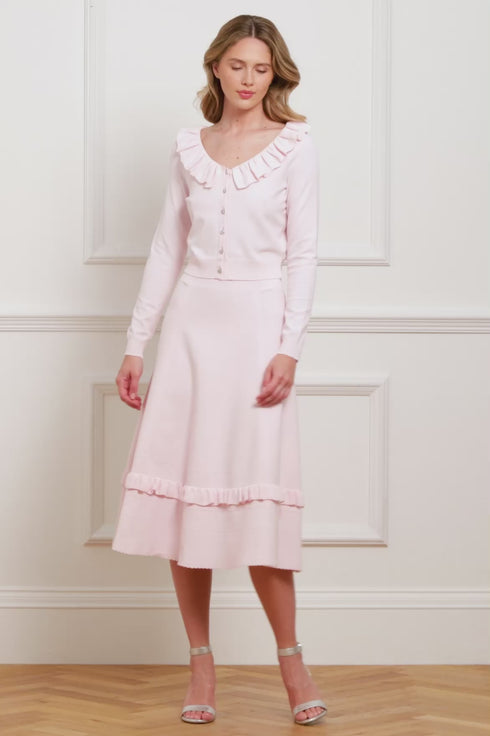 The Pointelle Trim Knit Skirt in Pink. This beautifully crafted skirt features intricate pointelle stitching, delicately adorning the hem and soft frill for a feminine, romantic finish. A flattering stretch waistband ensures both comfort and shape, while decorative pointelle detailing along the vertical seams adds subtle texture and elegance. Finished with a finely knitted scallop edge at the hem, this piece blends timeless craftsmanship with modern charm—perfect for elevated everyday styling or special occasions. Style with the Pointelle Trim Knit Short Cardigan for a beautifully coordinated look.